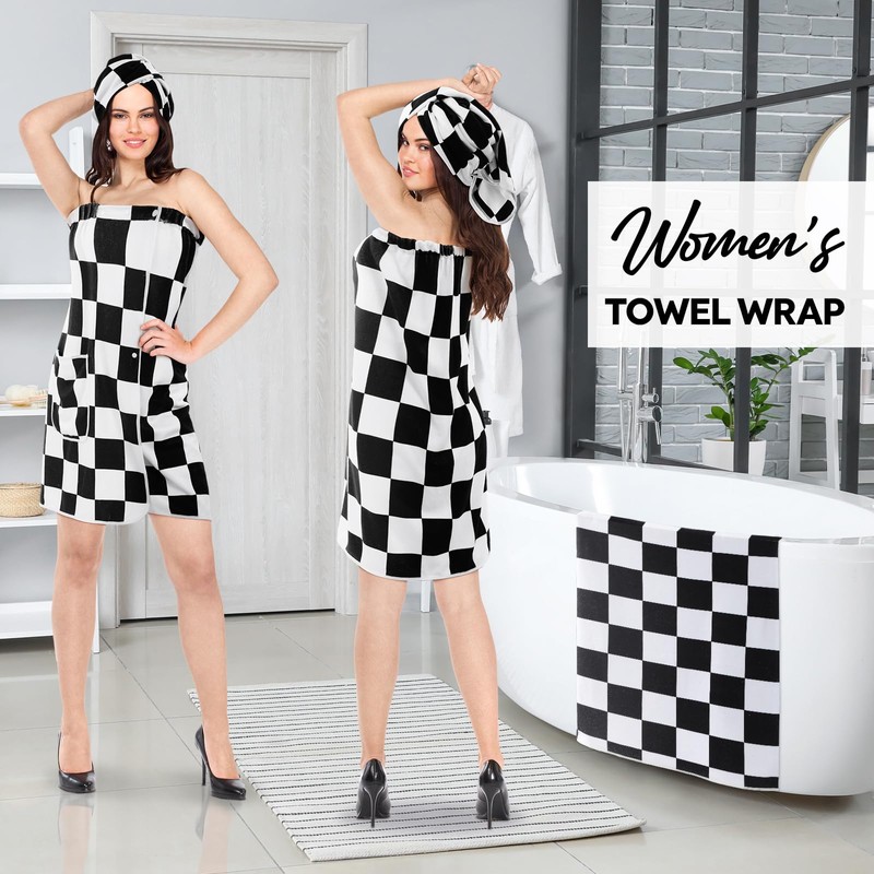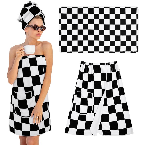 Fanfanwin 2 Pcs Checkered Bath Shower Wrap with Hair Towel, Black and White Checkerboard Wrap Towels for Women Soft Body Towel with Adjustable Closure and Pockets Bathrobe(M)