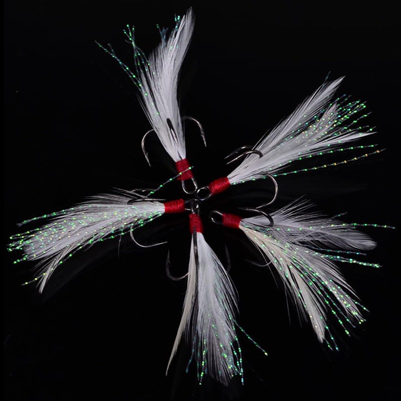 - 20PCS TREBLE HOOKS AVAILABLE IN 1 SIZES - 20Pcs black treble hooks with white feather. Size 4# ensure the pleasure of fishing continue