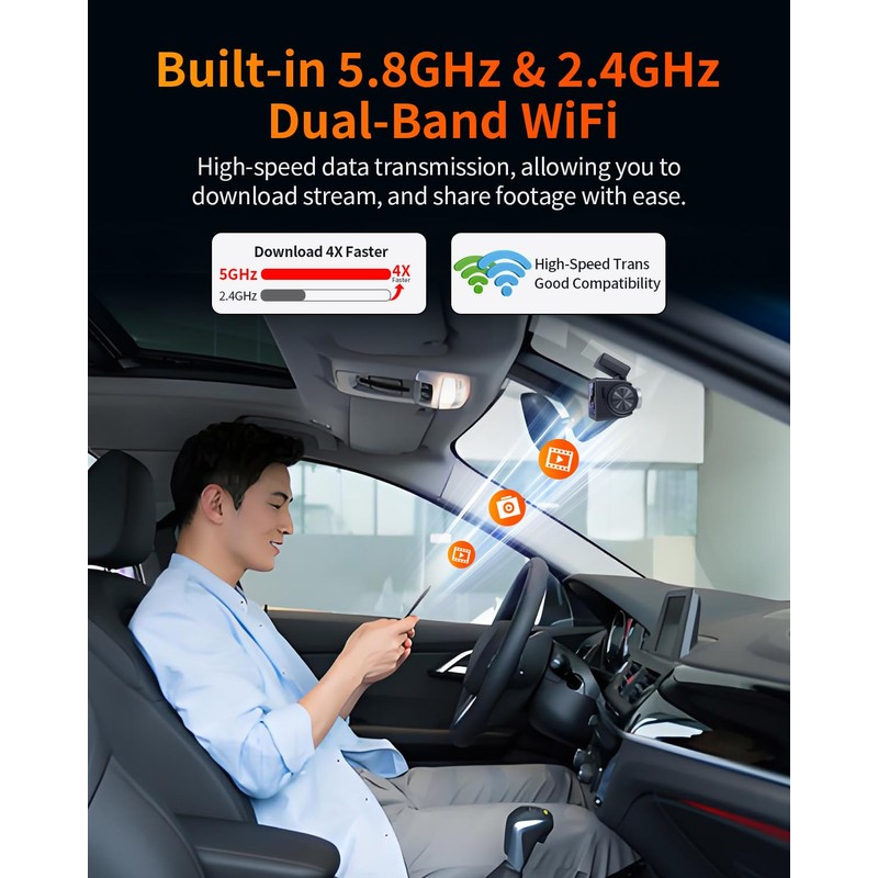 - 【2.4G/5.8G Wi-Fi, GPS, FANINSO APP(FREE)】The dual camera dash cam connects to the FANINSO APP via 5.8G Wi-Fi, enabling faster browsing and downloading of videos on mobile devices, as well as playback of GPS driving speed, location information, and device settings.