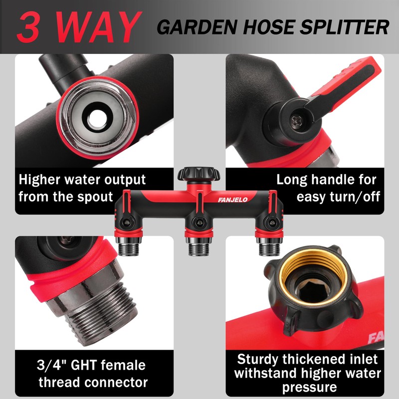 FANJELO 3 Way Hose Splitter, Heavy Duty Garden Water Hose Bib Spigot Splitter, Faucet Splitter with Shutoff Valve, Garden Hoses Connector for T Adapter, 3/4 - Inch GHT Thread (Red)