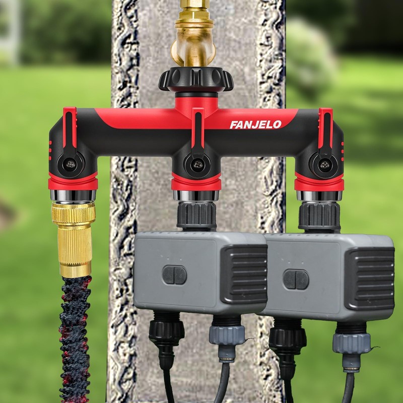- EASY INSTALLATION: To support multiple irrigation timers or larger timers, we have increased the distance between spouts to 2 inches. Water hose splitter features easy-to-turn handles that operate smoothly, even when wet. With a simple twist, you can control the water flow, making it user-friendly for everyone in the family, from children to experienced gardeners