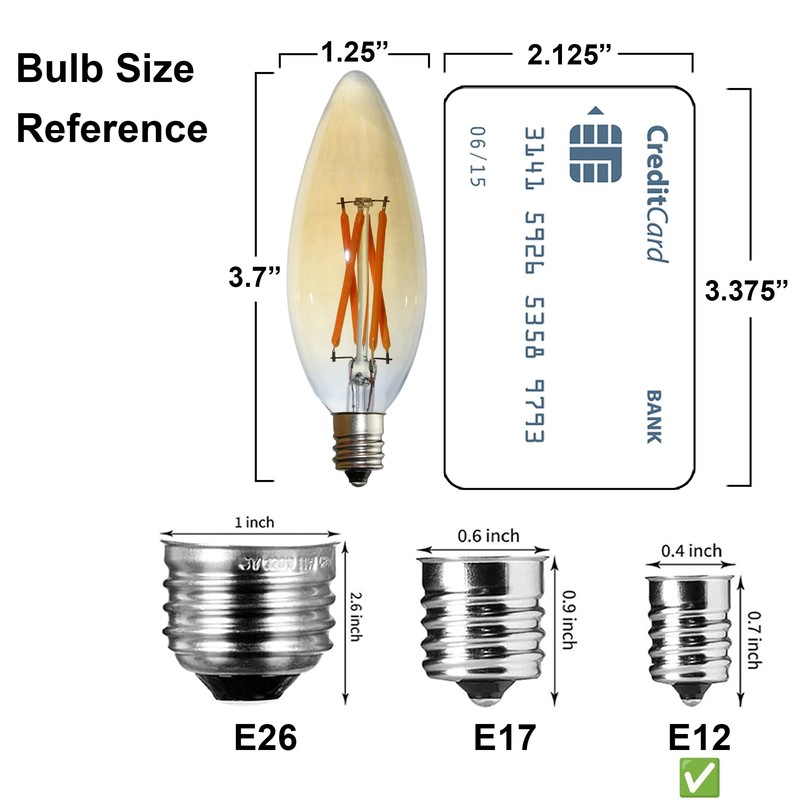 - 💡【Easy to Use】With approximate size of 3.7 x 1.25 inches, this light bulb is effortlessly manageable and user-friendly. This bulb features an E12 base, making it easy to install and compatible with a variety of lighting fixtures, including desk lamp, bedside lamp, floor lamp, chandeliers light, sconces light, and pendant light, candelabra light, ceiling fan.