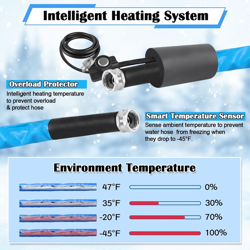 • 【Intelligent Energy-Saving】The FANOVO 25ft camper heated water hose built-in smart heating system automatically adjusts to temperature changes, and also comes with a smart switch. Advanced intelligent temperature control system automatically adjusts the heating temperature and output power according to the temperature saving your energy, equipped with overload protection function to avoid water pipe rupture due to overheating, further improve safety. NOTE-Make Sure the Thermostat Exposed to Ambient Temperatures When Using.
