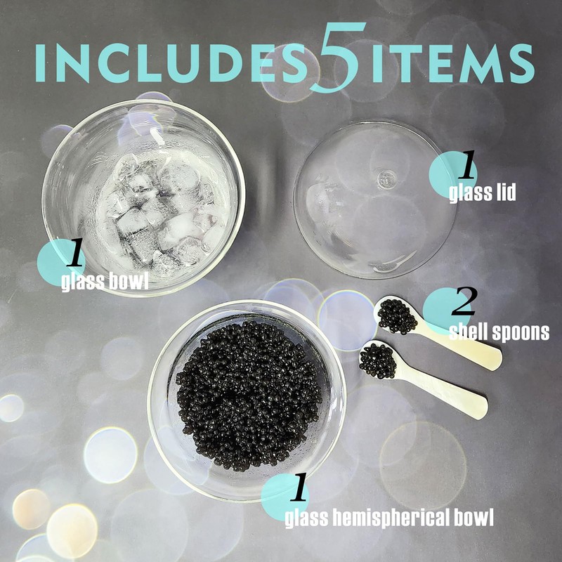 - Elegant Glass Set:The glass caviar server set includes 1 glass bowl,1 glass hemispherical bowl,1 glass lid,and 2 mother of pearl shell spoons.The glass set is blown from lead-free glass,and The shell spoons showcasing a charming pearl luster
