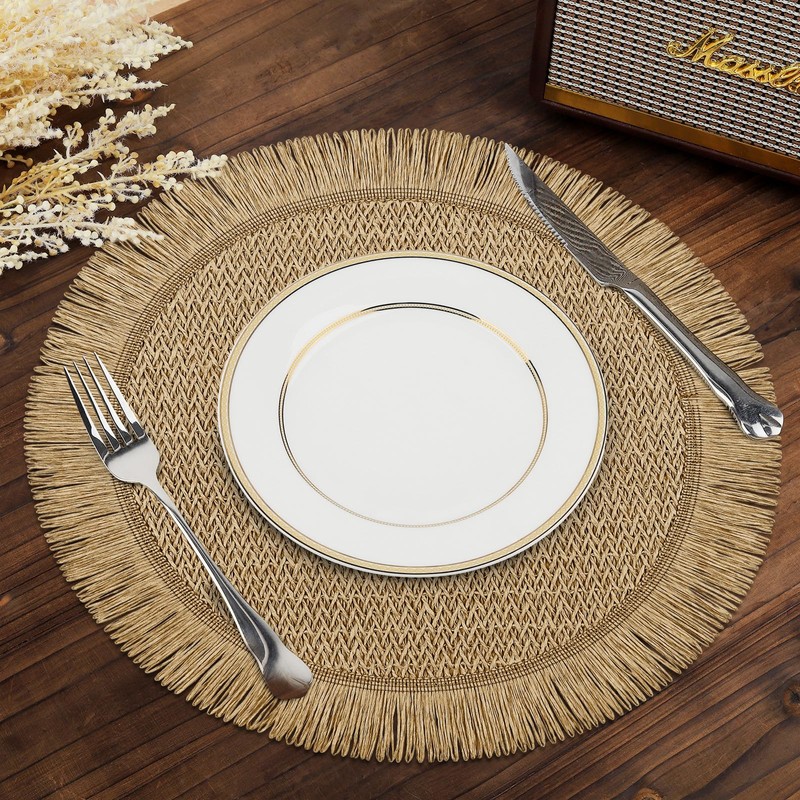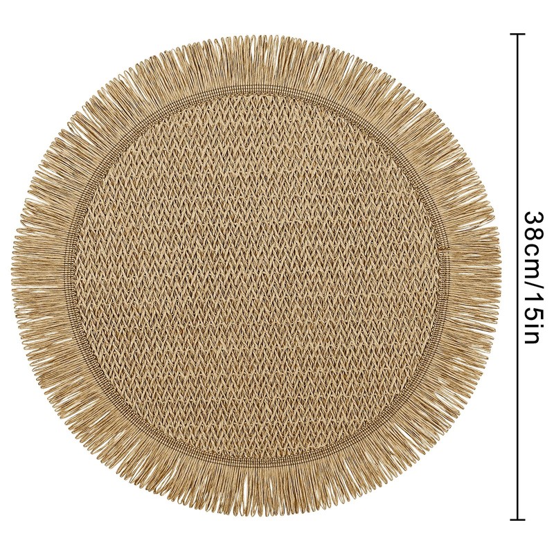 fanquare Boho Round Paper Placemats 15'' Set of 6, Rustic Woven Fade-Safe Tablemats,Braided Placemats for Home, Cafe or Events, Brown