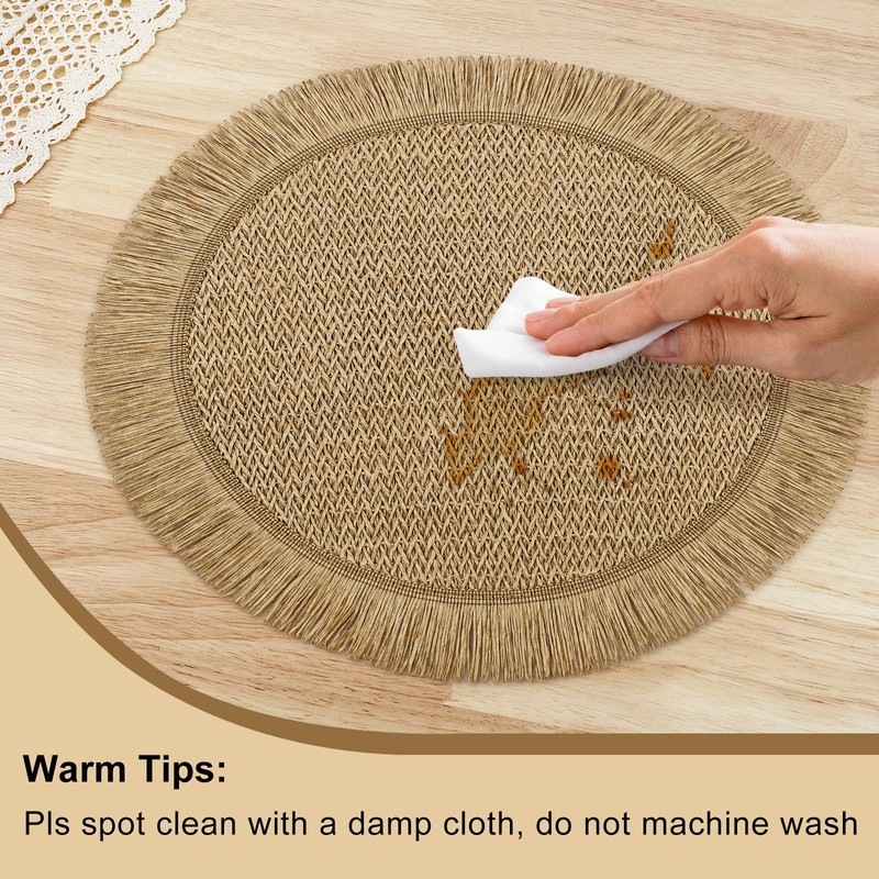 Core Values & Eco-Friendly Craftsmanship:This set of six features a 15-inch round design with rich texture, meticulously crafted from densely woven recycled fibers for exceptional tear-resistant durability. Made with recyclable materials, these placemats are a conscious choice for eco-minded homes. Laboratory-tested dyes ensure fade-safe vibrancy in our signature Sage Green, embodying sustainable style without compromise. Performance Features & Versatility:Their unique braided texture creates a non-slip grip, keeping tableware stable—ideal for bustling cafes or lively family dinners. The timeless boho aesthetic complements modern farmhouse, contemporary, or chic decor seamlessly.