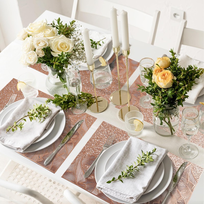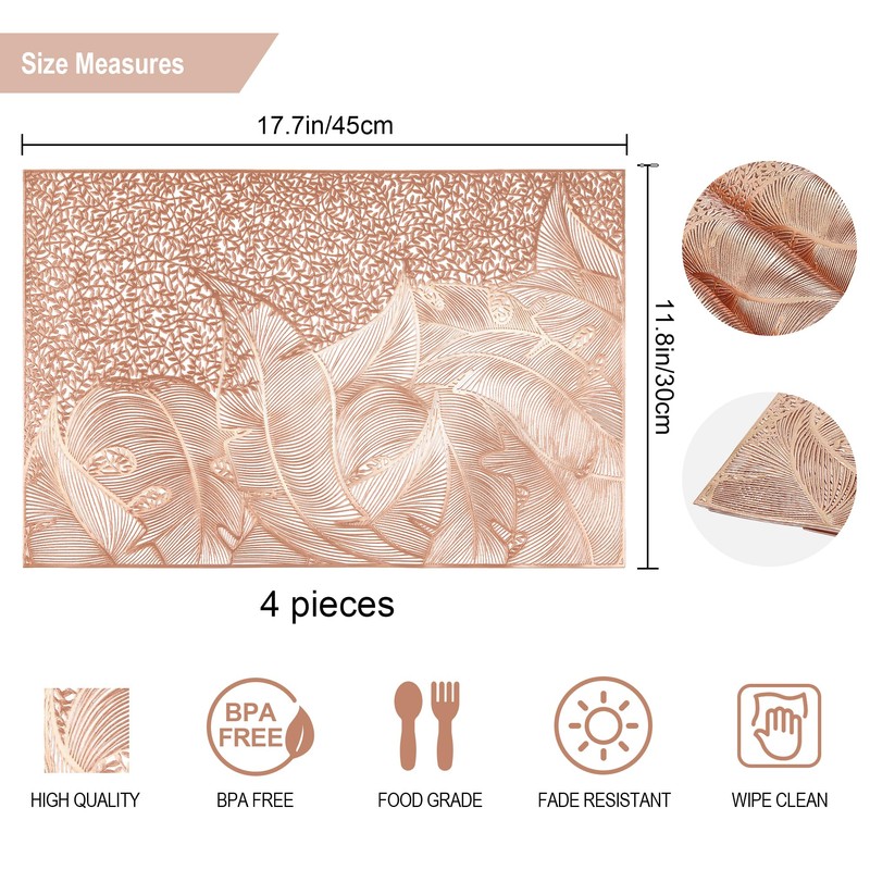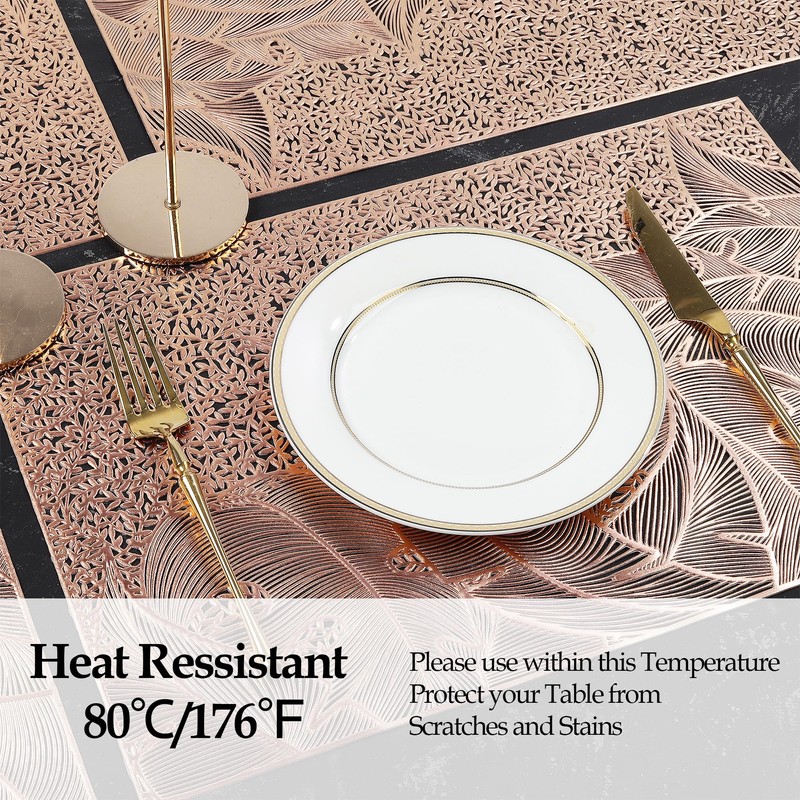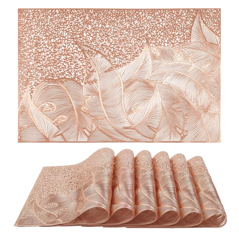 The fanquare Set of 6 PVC Place Mats is a must-have addition to any dining table. Our placemats are not only heat resistant but also durable and long-lasting. The elegant leaf design in rose gold adds a touch of sophistication to your dining area.