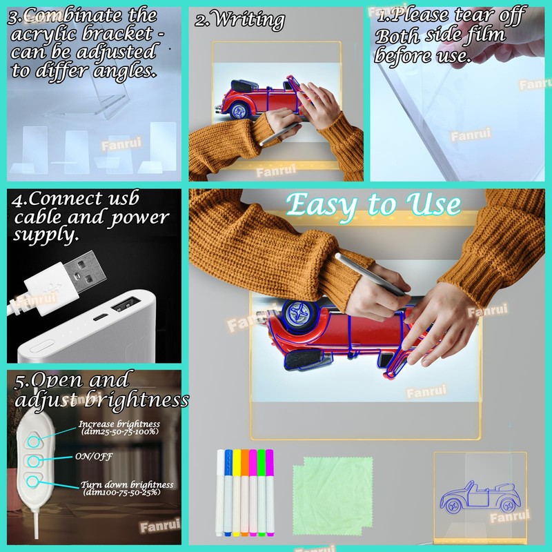 - 【Package Included】1 x Creative Acrylic Board, 1 x Acrylic Lamp Holder, 7 x DIY Erasable Pen, 2 x Clean Cloth.The 7-color pen to extend your use time, and a 4.9-foot-long USB extension cable to solve your problem of the USB cable not being long enough.