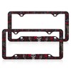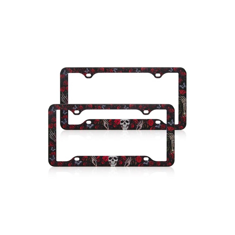 FantasHome Stainless Metal Car License Plate Frame Covers with 4 Holes - 2 Pack with Unique Designs, Standard Size for U.S. and Canada (Rose & Skull)