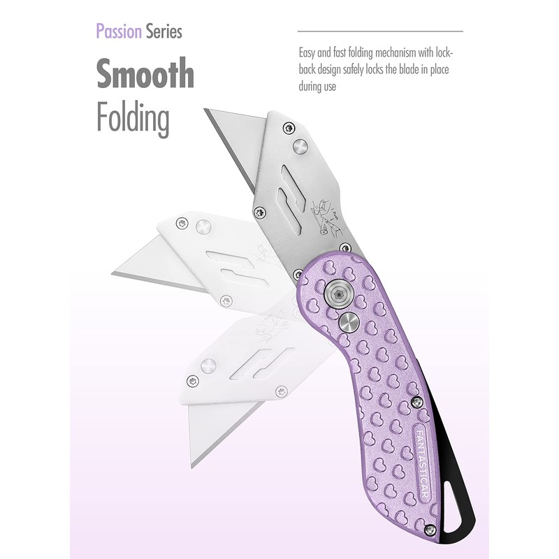 FantastiCAR Folding Utility Knife, Cute Metal Box Cutter with Extra 5 Sharp Blades, Quick Blade Change, and Preminium Gift Packaging, for Cardboard Opener, Paper Cutter (Pink Hearts)