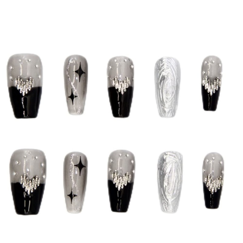 Fantasticlady,Medium Press on nails,Handcrafted,Christmas,Silver Heart Design,black,Punk style