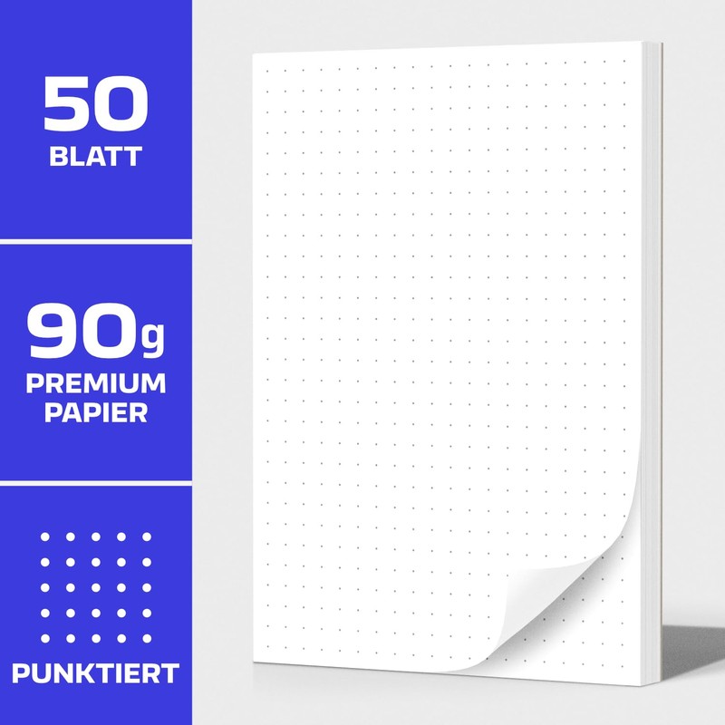 - Pack of 10 A6 notepads with 50 sheets per pad, dotted on one side with 5mm dot grid, made from extra firm, bright white 90gsm premium paper for comfortable and reliable writing.