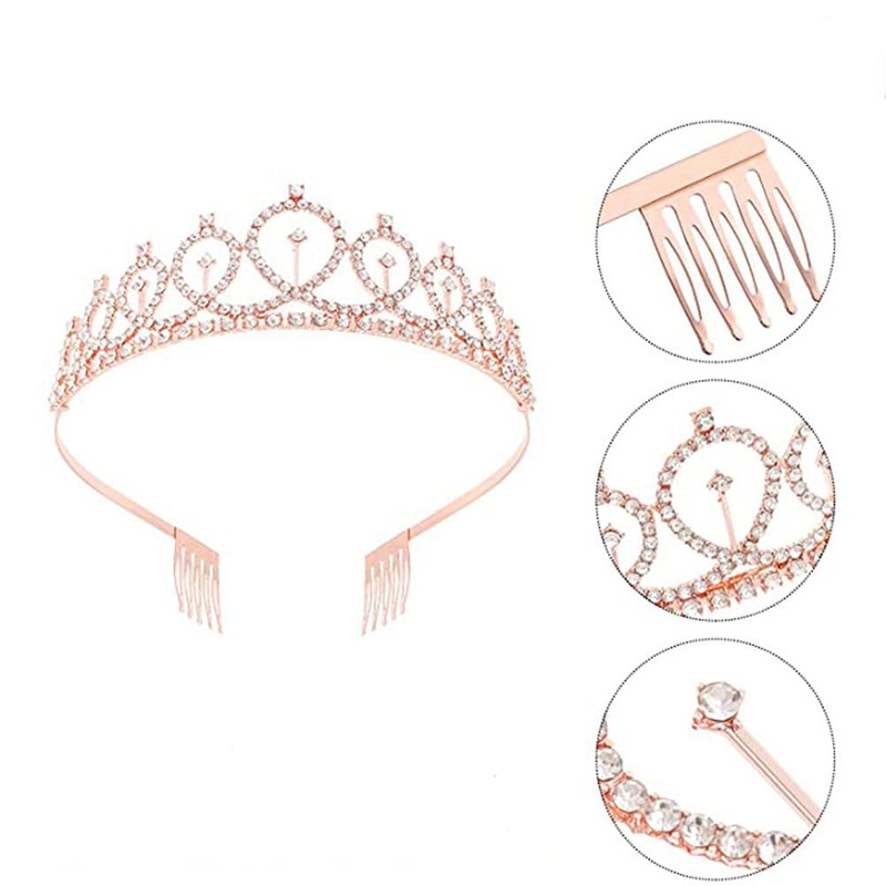 - Material: Fabric + Alloy + Rhinestone; Color: Rose Golden; Size: Crown 12x4cm/4.72x1.57inch, Sash 158x9.5cm/62x3.74inch; Package: 1 Set; Weight: 80g.