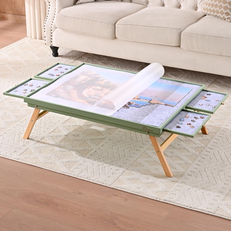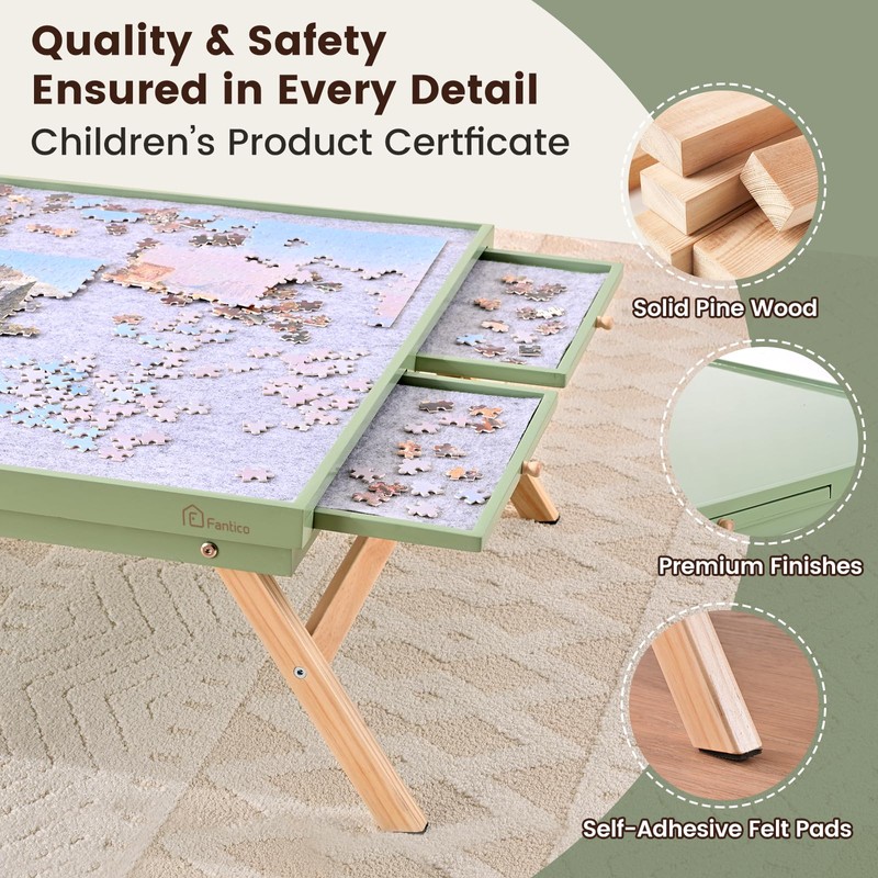 Fantico 1500 Pieces Wooden Jigsaw Puzzle Board with Foldable Legs, 35"x26.8" Puzzle Table with 4 Drawers and Protective Cover, Large Wood Folding Jigsaw Puzzle Table for Adults and Teens, Mint Green