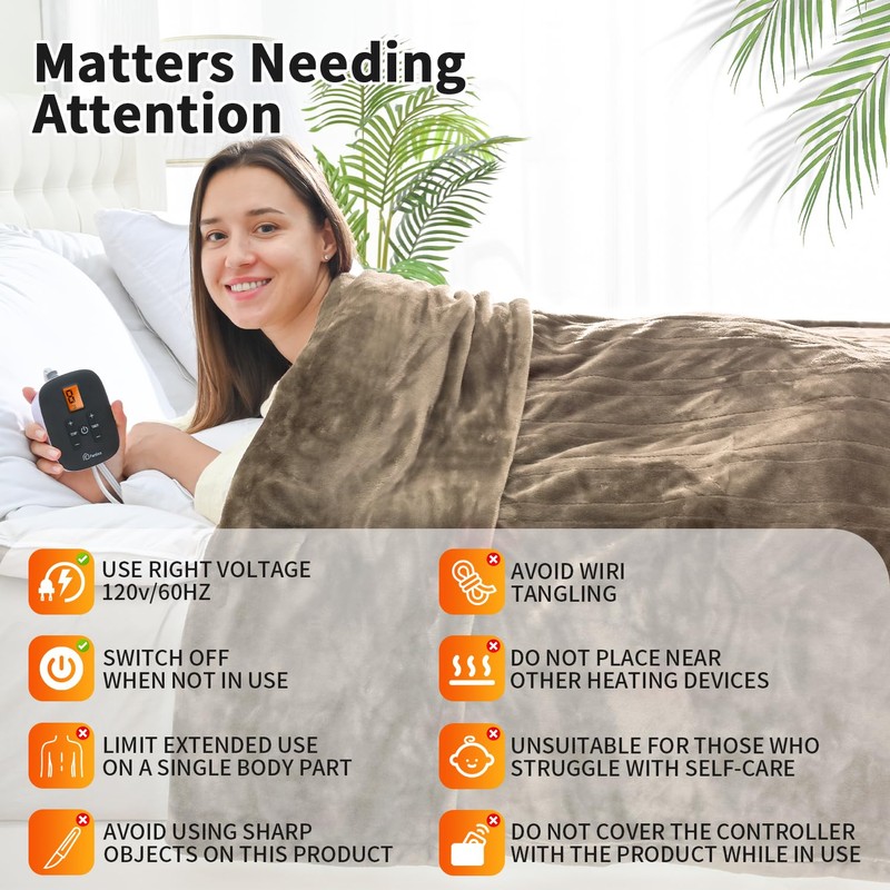 - Customized Warmth Experience: This electric blanket comes with 10 preset heat settings, from a cozy 85℉ to a toasty 115℉, ensuring the perfect comfort level for any climate. The auto-off timer will give you peace of mind by shutting down the blanket after 12 hours of use. Plus, the 19-foot power cord provides plenty of reach, making it easy to place your blanket wherever you need it without hassle