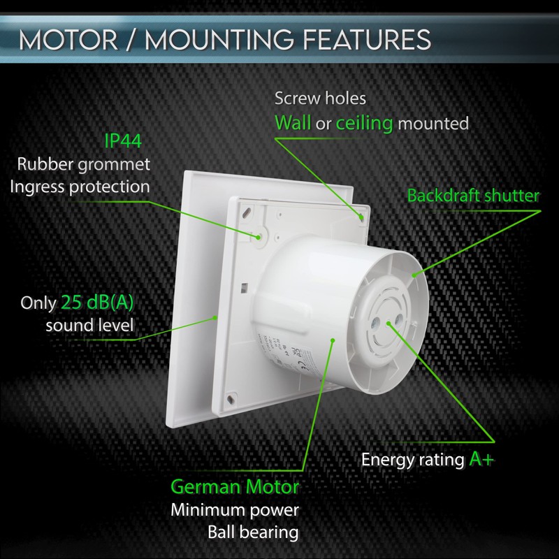 - Operation: Features a built-in humidistat and timer with an adjustable humidity sensor (60% to 90%) and a delay timer (2 to 30 minutes), powered by a reliable German motor with maintenance-free bearings for 40,000 hours of operation, and functions effectively at temperatures from +1°C to +45°C.
