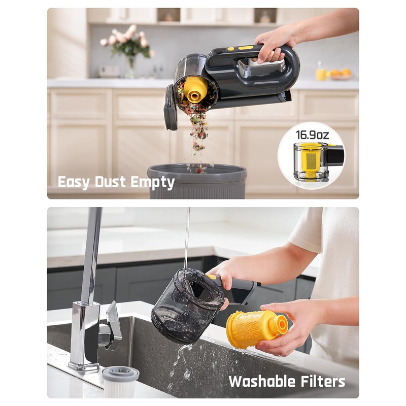 • One-Click Dust Emptying & Detachable Dust Bin: This vacuum is designed with one-click dust emptying feature, allowing you to dispose of dust without touching it. The dust bin is detachable and easy to wash, keeping the inside hygienic. The vacuum also includes a washable, removable, and reusable HEPA filter, which should be cleaned every 2-3 months and completely dried before putting it back. For added convenience, a replacement filter (Model: AV1001) is included
