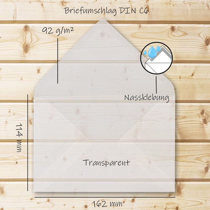 - Paper envelopes Color: Transparent White Grammage: 92 g m² Format: DIN C6 114 x 162 mm 11.4 x 16.2 cm With wet glue and gum, without window