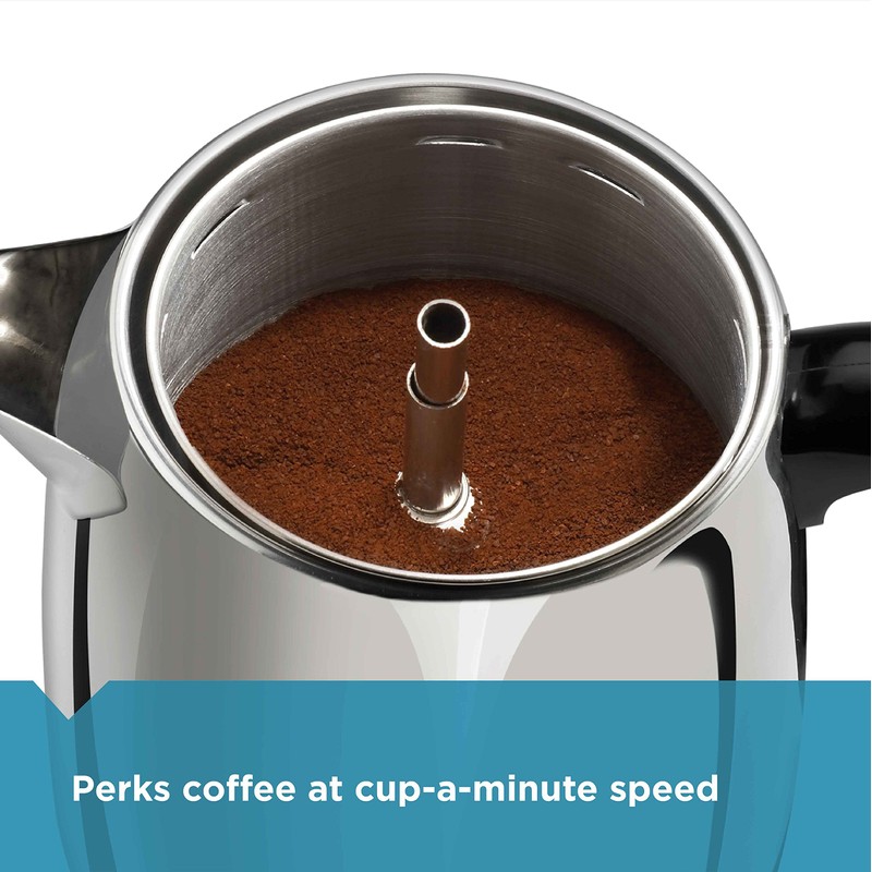 Farberware's 1000-watt, two- to four-cup percolator quickly brews at cup-a- minute speed for coffee in no time. Once the brewing is complete, the percolator automatically switches to "keep warm" temperature. Stainless steel construction offers durability and the detachable cord makes for easy serving. Rolled edges offer safe handling as do the stay cool handle and cover knob.
