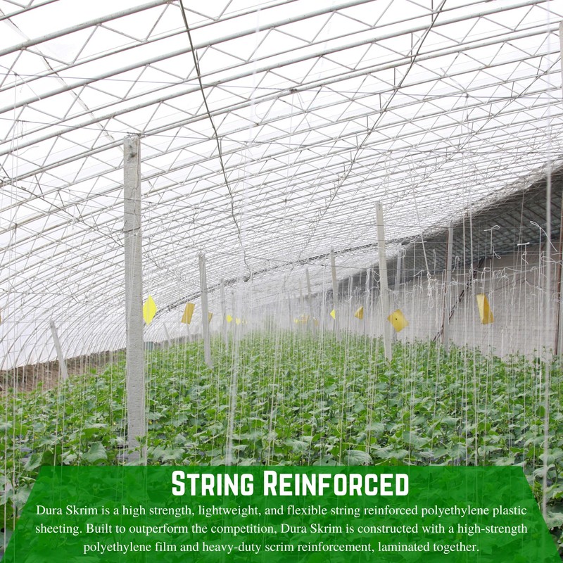 - 10 Mil String Reinforced Greenhouse Plastic Sheeting - Dura Skrim is a high strength, lightweight, and flexible string reinforced polyethylene plastic sheeting. Built to outperform the competition, Dura Skrim is constructed with a high-strength polyethylene film and heavy-duty scrim reinforcement, laminated together.