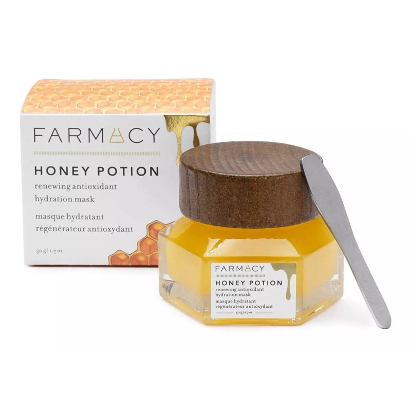 Dry Skin Be Gone: Honey Potion face moisturizer brings out your natural glow with a combination of antioxidant-rich honey, healing propolis and royal jelly. Feel soothed and revitalized in minutes.; Warming Massage: When the skincare face masks glycerin comes in contact with the skin and is gently massaged, it transforms into a rich cream with a warming sensation giving you spa-like luxury in your own home.; Cichoric Acid: The hydrating face mask contains a high concentration of cichoric acid, which aids in the protection of your skin by supporting natural collagen.; How to Use: Scoop a generous amount of the honey mask from the jar and spread a thick layer gently across the face from forehead to chin (avoiding direct contact with eye and lip areas) and down to the neck and décolleté. Massage for one to two minutes, and the mask will begin to warm as it transforms to a rich cream texture. Leave on for 10 to 15 minutes, then rinse off and pat face with towel to dry.; The Farmacy Way: Our goal is simple. We want to bring out the best version of your radiant self with the best possible, naturally derived ingredients. Each womens skincare and beauty product we craft uses cutting-edge science to harness the healing powers of ingredients that Mother Nature has been so kind as to provide for us. About the Mask Keep dull and dry skin in your rearview mirror this summer with the Honey Potion Hydration Mask. The warming massage face mask nourishes and enhances your skin leaving it noticeably more supple after just one use. Our proprietary honey is rich in antioxidants that enhance the creams hydrating effects. 1.7 fl.oz / 50g Sustainably sourced from happy, healthy bees living on our beautiful upstate New York farm. After a 2 week study, 100% of our panelists indicated that Honey Potion left the skin with a smooth complexion and younger appearance. About Farmacy Farmer Cultivated Scientist Activated. We use cutting-edge science to harness the healing powers of ingredients found in nature. The result is farm-to-face skincare that lives up to its full potency and potential through clean, thoughtful formulas. Todos nuestros productos estan en inglés SKU 1042239763