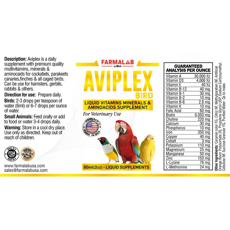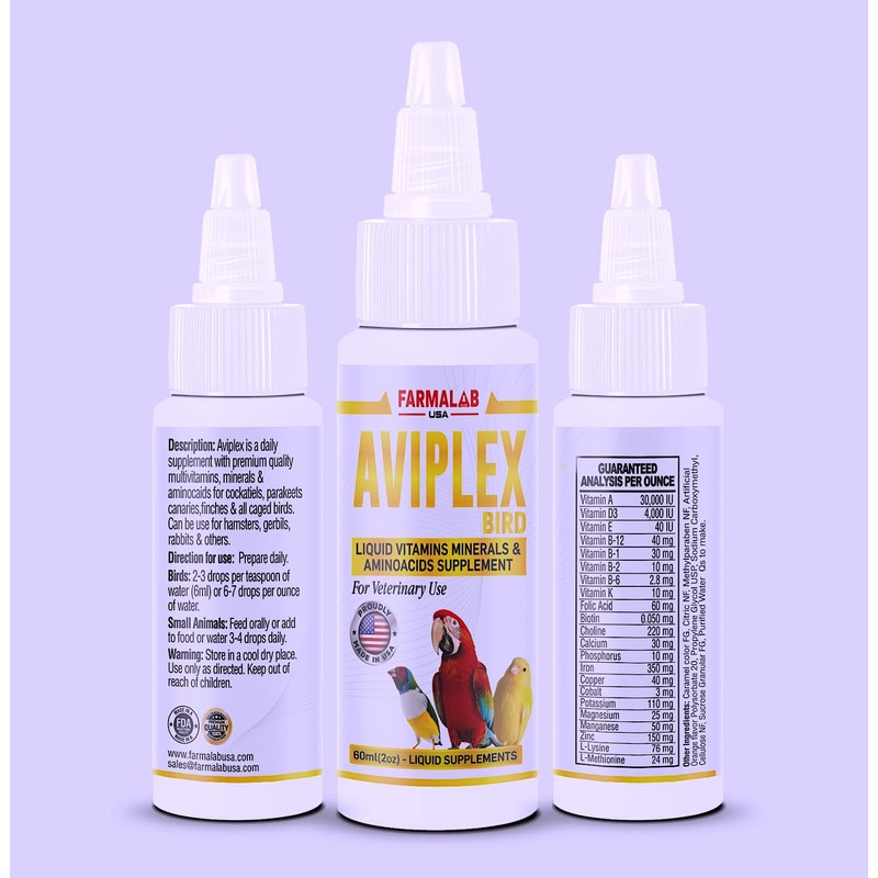 Farmalab AVIPLEX Liquid Vitamins Minerals AMINOACIDS Supplement 60ml Budgies, Parakeet, Finches, Lovebirds Quakers All Caged Birds