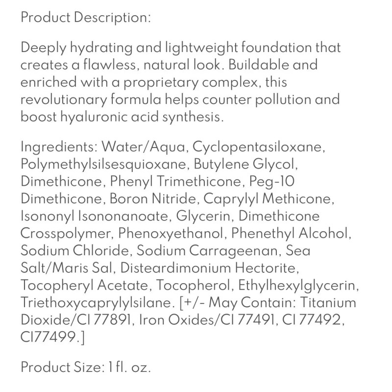 - Features: Animal Cruelty-Free, Anti-Aging, Formaldehyde-Free, Gluten-Free, Hydrating, Long Lasting, Oil-Free, Buildable, Deep Hydration, Light & Velvety Texture, Fragrance Free