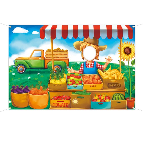 Farmer Market Party Backdrop 5 x 3.3 ft, Farmers Market Stall Photography Background, Farmer Face Cutout Photo Props, Farmer Market Party Decoration, Vegetable and Fruit Theme Face in Hole Photo Prop