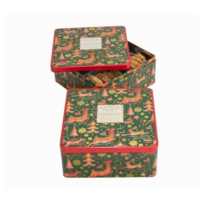 - Decorative tin is filled with a selection of 2 British "biscuit" / cookies: cranberry orange & milk chocolate cookies.