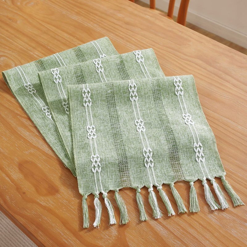 Farmhouse Braided Striped Table Runner with Handcrafted Tassels, Boho Linen Table Runners 48 inches Long for Holiday Party and Dining Room Decor, 13 x 48 inch - Sage Green
