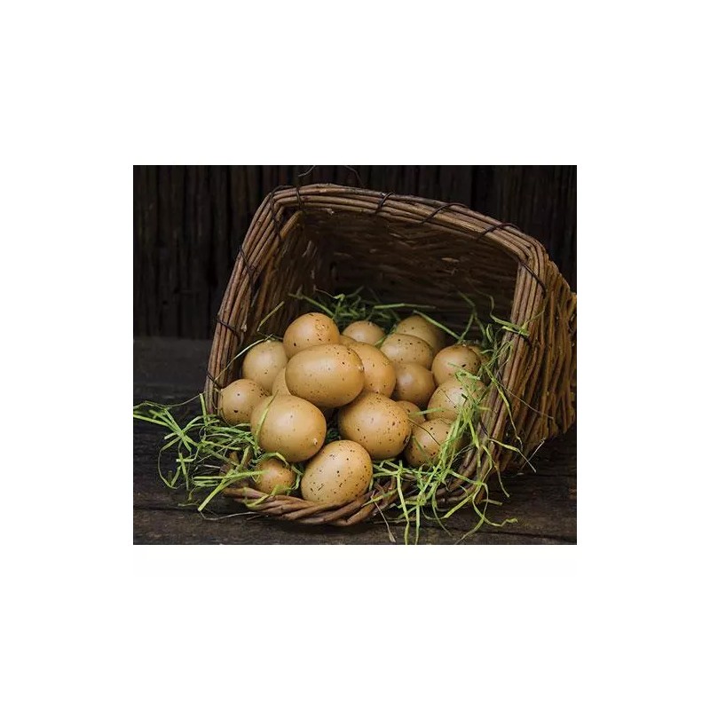 Brown Speckled Eggs comes 12 pieces in a bag and sizes range from 1" to 1½" long. Eggs are made of plastic.