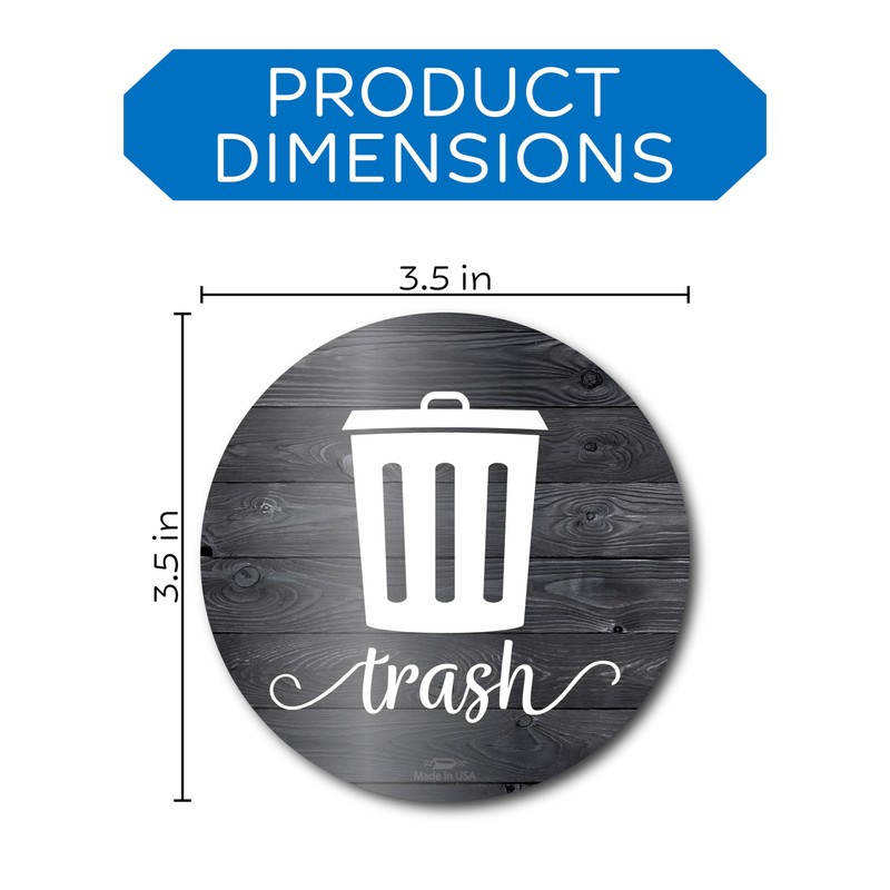 - Trash and Recycle Stickers - Each trash decal and recycle sticker measures 3.5 inches and will compliment your home kitchen decor while providing a functional use on your trash and recycle bin combo.