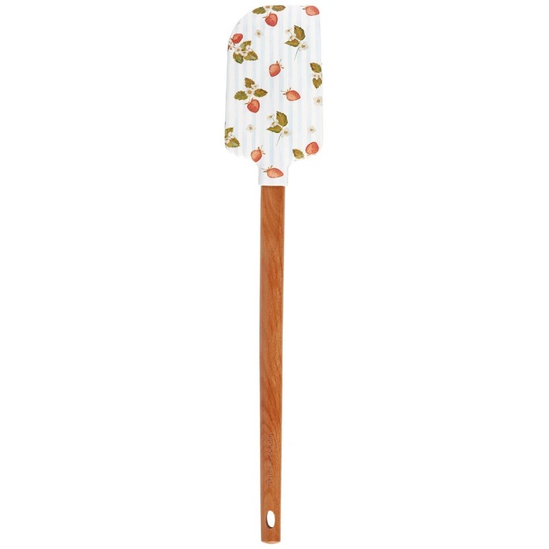 A double-sided silicone spatula from our Garden Collection displaying charming designs of wild strawberries with a complementing light stripe pattern. Designs are replicated from original artwork hand painted in a watercolor style. Logo is engraved into wooden handle for added interest. Our Strawberry spatula includes a coordinating decorative bow and hole at the bottom for hanging. Hand-wash recommended; not microwave safe. A strawberry-themed kitchen accessory perfect for everyday use.