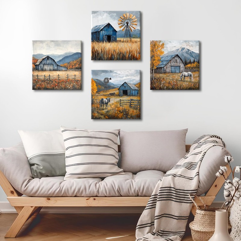 Farmhouse Wall Art Rustic Fall Kitchen Decor Country Windmill Barn Landscape Canvas Prints Pictures Western Farm Animal Horse Paintings Artwork Living Room Dining Room Home Decorations 12x12" 4Pcs