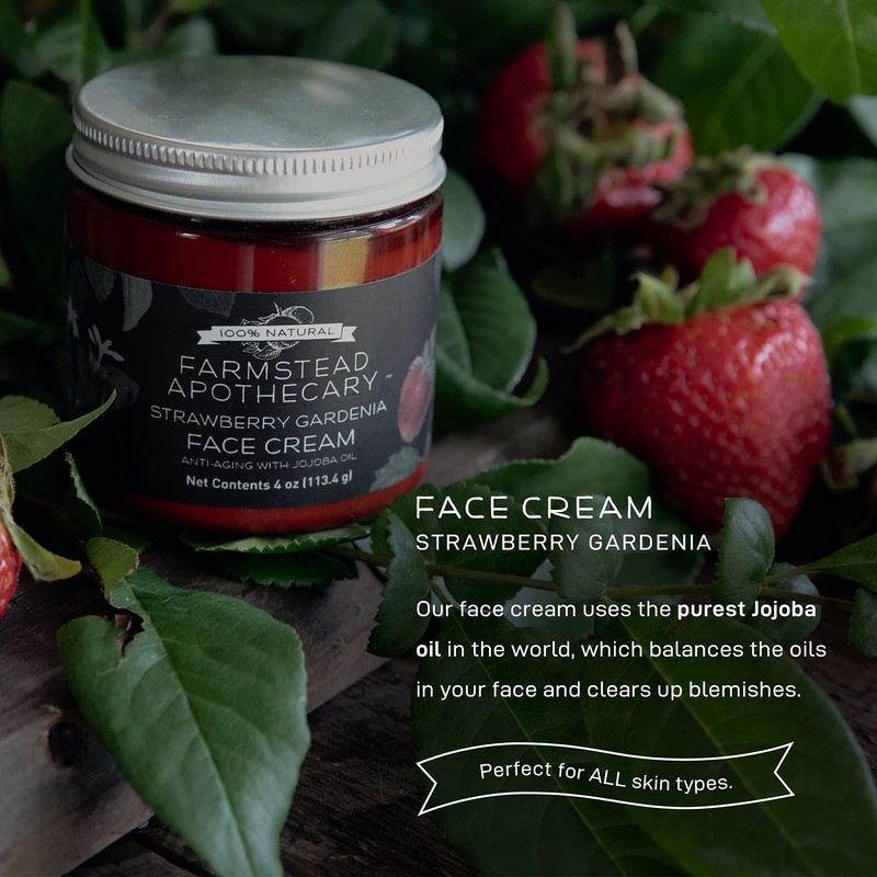- STRAWBERRY GARDENIA FACE CREAM - Our face cream is perfect for ALL skin types. We use the purest Jojoba oil in the world, which balances the oils in your face and clears up blemishes. Jojoba oil is anti-aging, helps reduce acne, hydrates skin, and reduces oil production where needed. Look no further for a perfectly balanced face cream that's scented with real fruit for extra antioxidants!