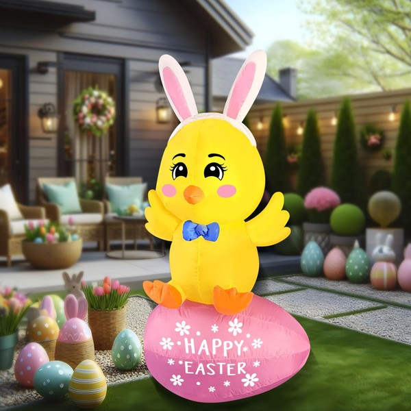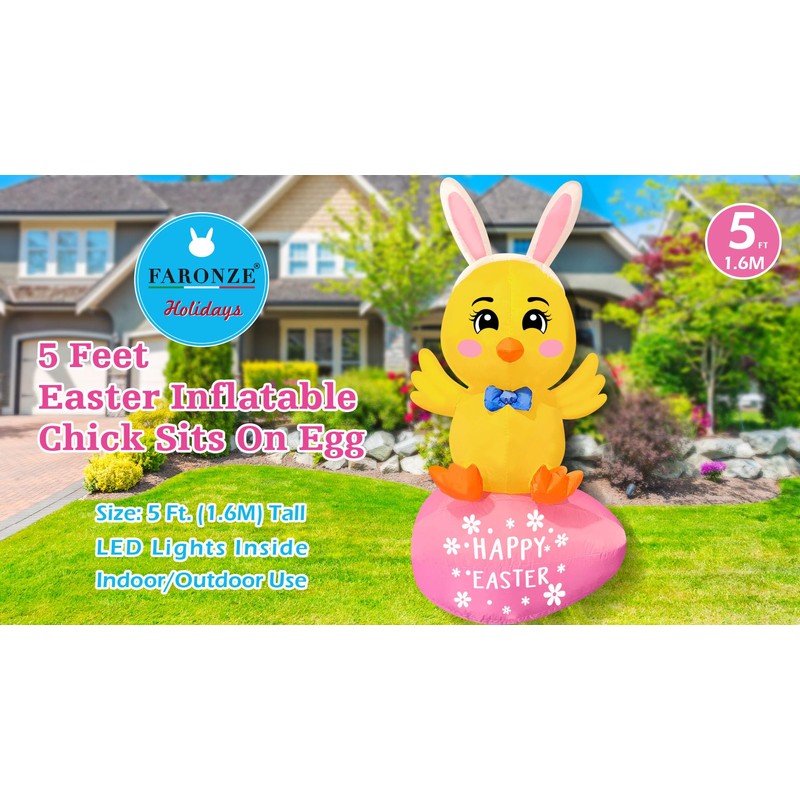 FARONZE Easter Inflatable Chick on Egg Blow-up Lighted Indoor & Outdoor Easter Yard Lawn Decoration with Built-in Fan and Anchor Ropes (5Ft Chick Sits on Egg)