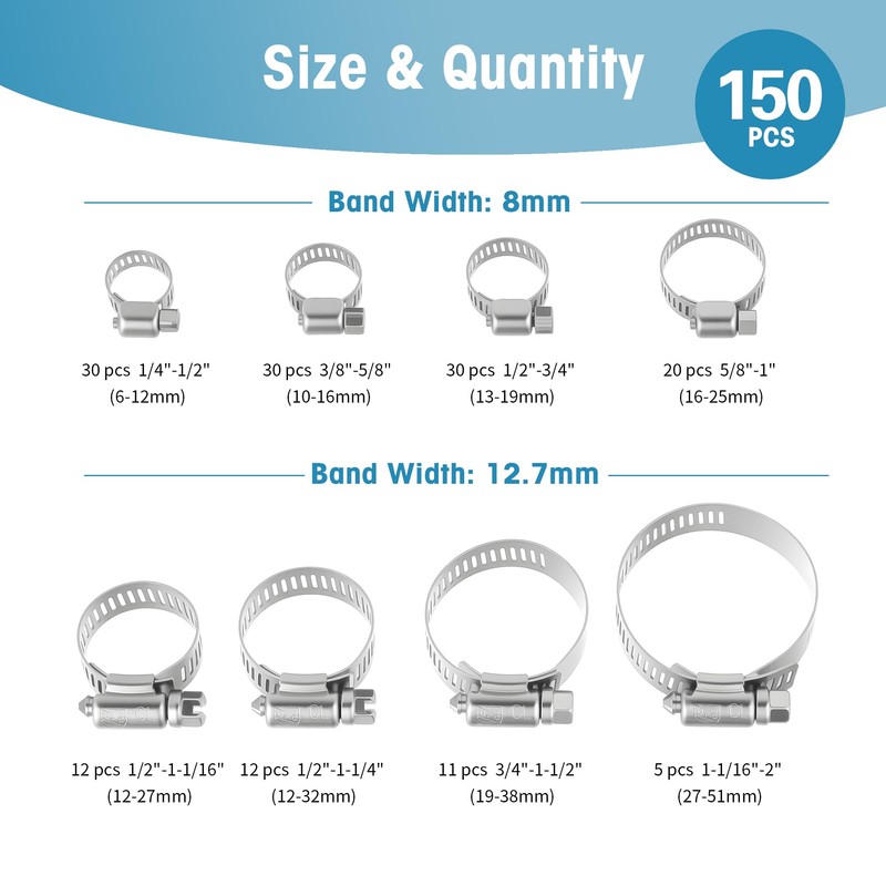 - Adjustable Size Range: Our 150pcs hose clamps assortment kit offers 8 different sizes, adjustable from 1/4 inch - 2 inch (6-51mm). These clamps can securely fasten hoses of varying diameters. Packaged in a plastic box, easy to store and carry