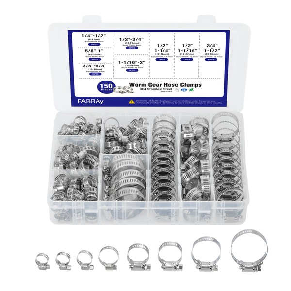 FARRAY 150 PCS Hose Clamps Assortment Kit, Adjustable 1/4"- 2"(6-51mm) Worm Gear Hose Clamps, 304 Stainless Steel Hose Clamps for Plumbing, Automotive and Mechanical Applications