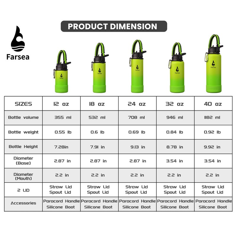 - WHAT YOU'LL GET: Farsea is committed to providing the best value and highest quality to the customers; We offer Continuous After-sales Service and Solve All Problems; We offer several different capacity bottles(12 oz, 18oz, 24 oz, 32 oz, 40oz) and you can choose according to your needs; Package: Comes with 2 lids (Straw lid & Spout Lid), paracord holder, protective Silicone Boot, nice packing box, 2 straws, and straw brush