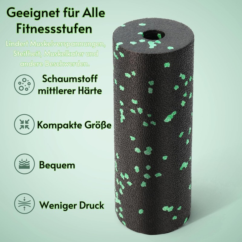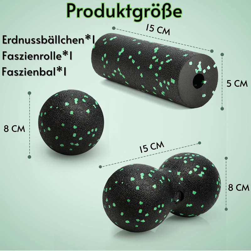 - Product dimensions: the fascia roller has a size of 5 x 5 x 15 cm, while the fascia ball measures 8 x 8 x 15 cm. Both products are ideal for self-massage of the entire body and allow targeted massage even in hard to reach areas. To ensure easy handling, they come in a handy storage bag that makes it easy to transport and store.