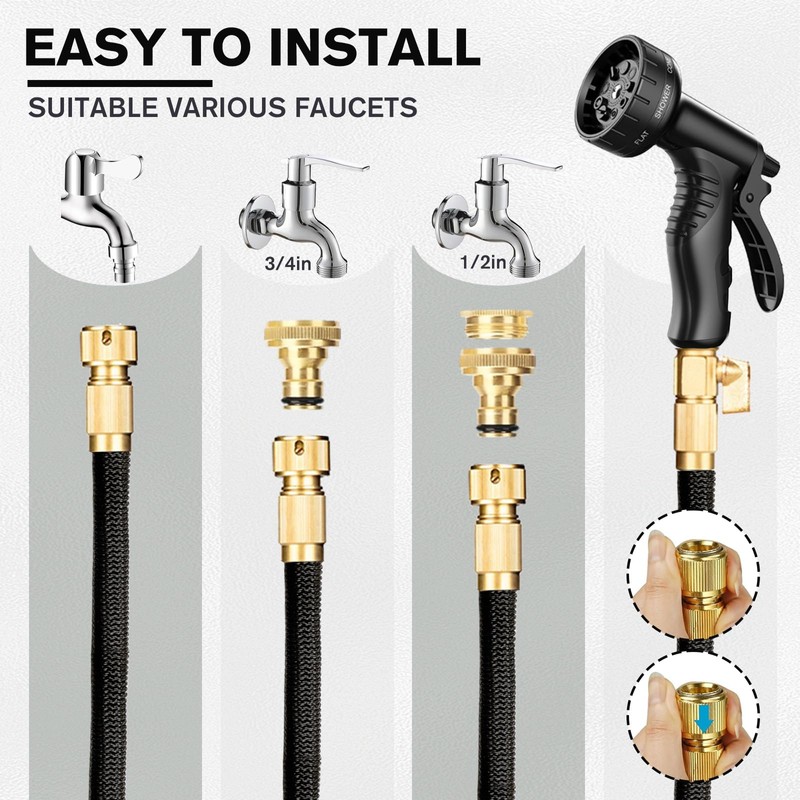 Merkmale:1. W?hrend der Wasserfluss in den erweiterbaren Schlauch eindringt, dehnt er sich um das Dreifache aus. Nachdem das Wasser abgelassen wurde, schrumpft er wieder auf seine urspr1ngliche Gr??e und spart so viel Platz. Sie werden Freude daran haben, Ihren Garten jeden Tag zu bew?ssern.2. Dieser Schlauch wurde f1r m1helose Man?vrierbarkeit entwickelt und ist ein Kinderspiel, um eine stressfreie Gartenarbeit zu gew?hrleisten.3. Hergestellt aus hochwertigem Latex, Polyestergewebe und Messing, h?lt dieser Schlauch der Abnutzung stand und h?lt Saison f1r Saison.4. Das Gartenschlauchrohr ist f1r die meisten Wasserhahnanschl1sse geeignet (1/2 Zoll, 3/4 Zoll). Und kompatibel mit Karcher-Hochdruckreinigern und Hozelock-Gartensprinklern, D1sen.Im Lieferumfang enthaltene 10-Muster-Spr1hd1se:1. Drehen Sie die L1nette, um eine von 10 einzigartigen Bew?sserungseinstellungen auszuw?hlen, die auf alle Ihre Bew?sserungsbed1rfnisse zugeschnitten sind.2. Das rutschfeste Gummipolster sorgt f1r einen sicheren Halt und erleichtert die Verwendung 1ber l?ngere Zeitr?ume.Warme Tipps:1. Bitte lassen Sie kein hei?es Wasser durch diesen flexiblen Schlauch laufen.2. Stellen Sie sicher, dass der Wasserdruck im normalen Bereich (3-10 Bar) liegt.3. Wenn der Schlauch vollst?ndig ausgefahren ist und in Betrieb ist, vermeiden Sie es, die D1se zu schlie?en, um Sch?den durch steigenden Wasserdruck zu vermeiden.4. Bitte nicht am Ausgang eines Hochdruckreinigers verwenden.5. Entleeren Sie Ihren Wasserschlauch im Sommer, wenn Sie den Dehnschlauch nicht verwenden, und halten Sie den Schlauch so weit wie m?glich im Schatten. Und sch1tzen Sie Ihren Zauberschlauch vor rauem Winterwetter, indem Sie ihn drinnen aufbewahren.