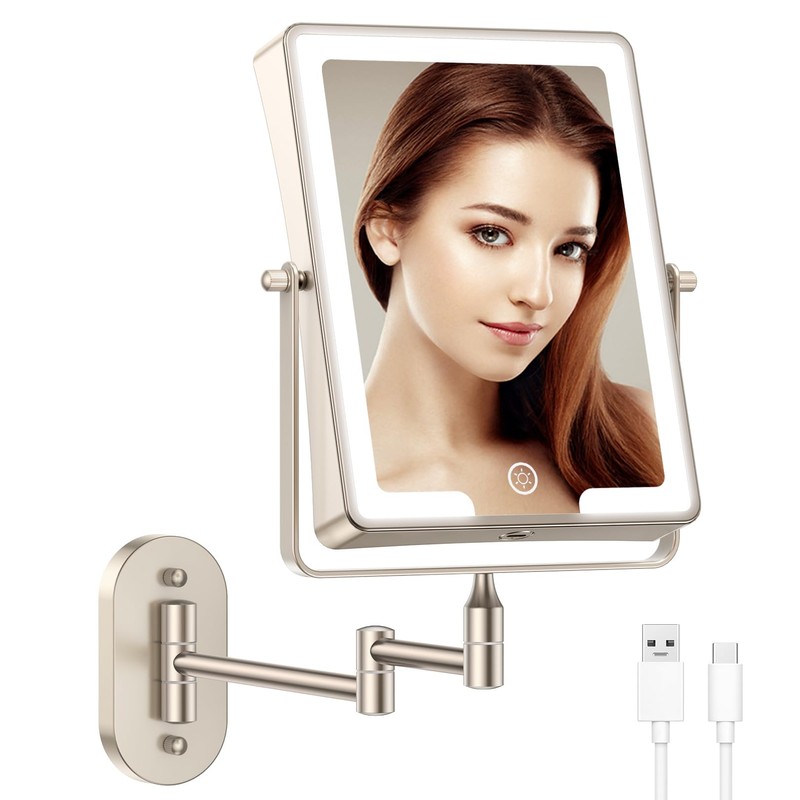 FASCINATE Rechargeable Wall Mounted Makeup Mirror, Bathroom Mirror Rectangle 8.7 Inch Double Sided 1X 10X Magnifying, 3 Color Setting, Extended Arm 360° Swivel Foldable Nichel