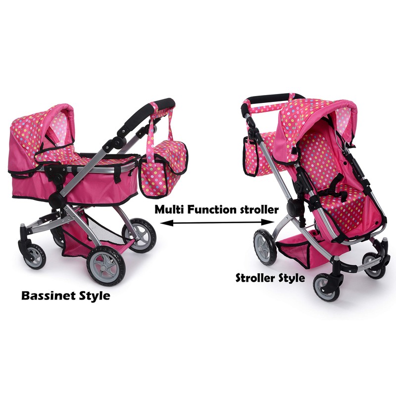 - TODDLER FRIENDLY DESIGN: Our baby doll stroller is a soft doll carrier with ergonomically designed handle, featuring a colourful pattern of bright polka dots on a pink background. This doll stroller for toddlers is the perfect buggy for your child's little princess baby dolls. Our stroller toy set features adjustable control handle and foldable bassinet for lightweight travel and have little umbrella.