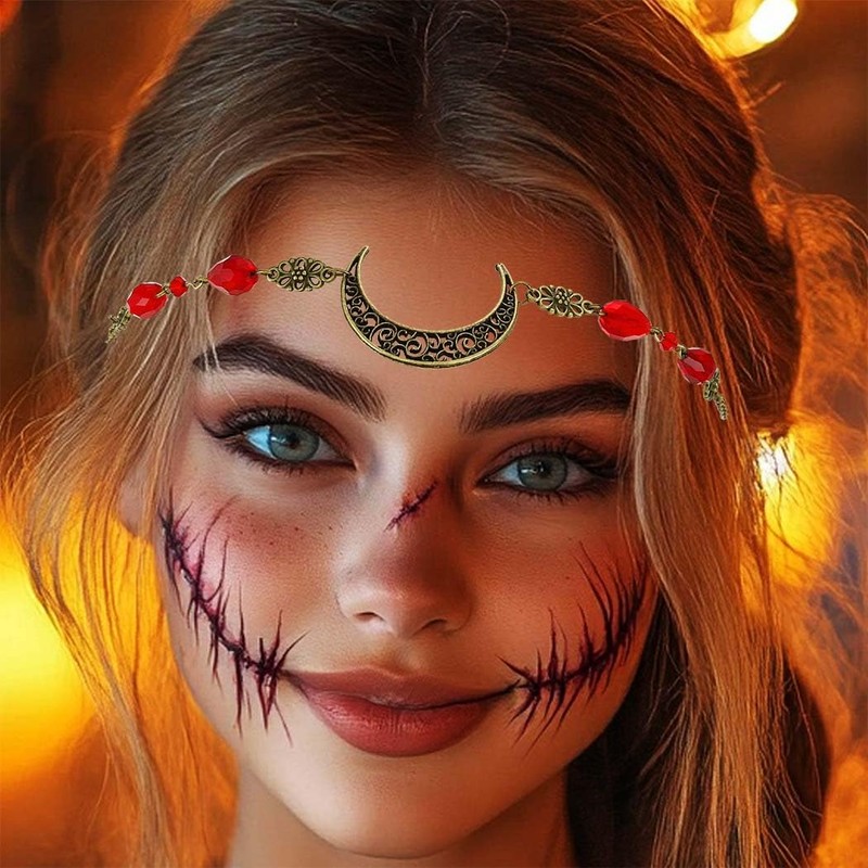 Fashey Moon Head Chain Rhinestone Hair Chain Gold Headpiece Gypsy Head Jewelry for Women (Red)
