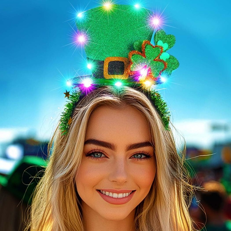 Fashey St Patricks Day Light Up Headband Led Green Hat Shamrock Hairband Irish Day Headbands Holiday Hair Accessories for Women and Girls
