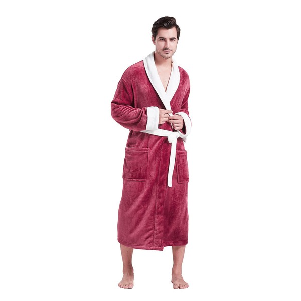 FashGudim Mens Robe Plush Robes for Men Warm Soft Fleece Bathrobe Calf Length Shawl Collar Short House Robes with Pockets, Red & White, Small-Medium