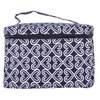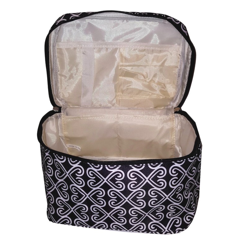 Fun Fashion printed fabric with nylon easy wipe clean lining. Waterproof and wrinkle resistant. Dimensions are 10" l x 7 1/2" w x 6" h. The base features 2 inner slip pockets and the lid has 4 brush holder pockets and additional slip pocket. Double zipper closure. Reinforced riveted handle. This can be chosen embroidered with a name or monogram. Approximate embroidery dimensions are 2" x 5". Custom embroidery and monogramming is non-refundable.