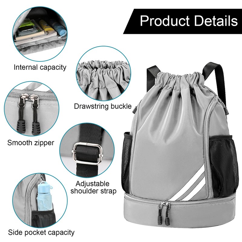 - Multi-pocket design: Side mesh pockets with elastic straps on both sides of the sports bag backpack can hold water bottles, umbrellas; front pocket for storing tissues and toiletries; the bottom is an independent shoe compartment; There is also an additional inner zip pocket in the rope pocket, which is large enough to hold small valuables such as sports watches, wallets, etc. to avoid pickpockets.