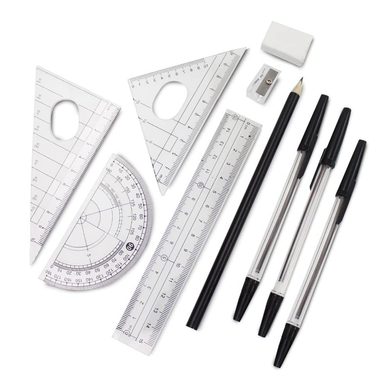 - Each black or pink zipped pencil pouch contains a 10 piece maths sets that includes a 15cm ruler, 180 degree protractor, 45 & 60 degree set squares, 3 black ballpoint pens, 1 pencil, 1 sharpener, 1 eraser.