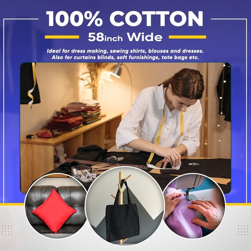 - 58 Inches / 147.5 cm wide premium quality cotton fabric, solid pattern and weaved plain. Medium weight 150 gsm material makes it easier to handle, wash, cut and sew